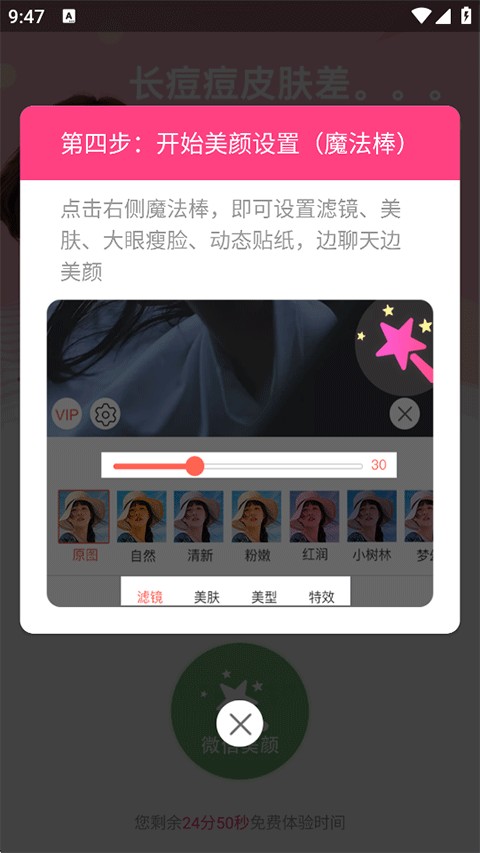 4、点击右侧魔法棒即可设置美颜、滤镜、美肤等效果,实现边聊天边美颜;