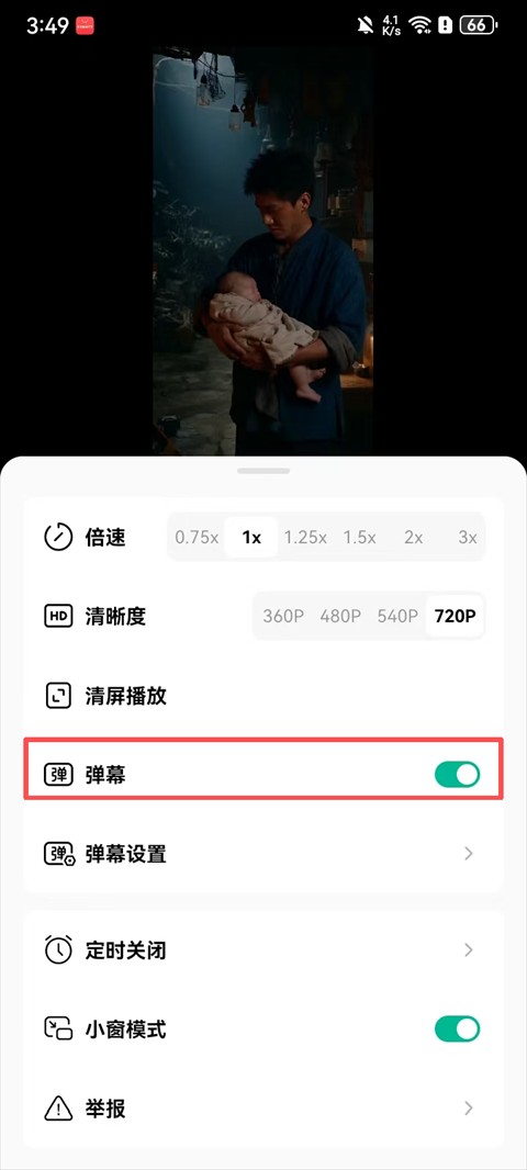 同样点击播放页的【...】,在弹出的底部菜单中开启弹幕即可。