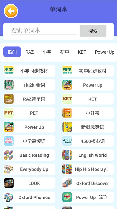 2、然后在打开的单词本界面中搜索或按照分类添加单词本