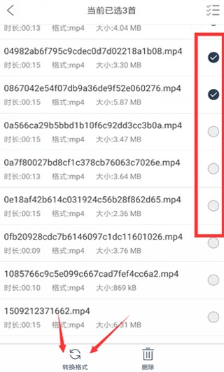 2、长按视频列表,进入批量管理页面,可以单选也可以多选,选择了视频之后,点击底下的“格式转换”按钮。