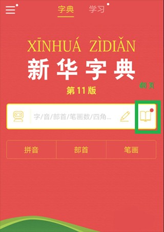 1、点开新华字典的界面,在白框中右侧有个书形的小黄标,点此可以实现屏端直接翻页。