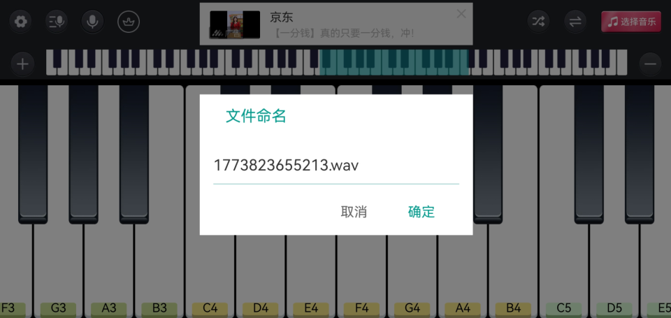 3、开始弹奏钢琴,演奏完成后再次点击“录音”按钮停止录制,并为文件命名;