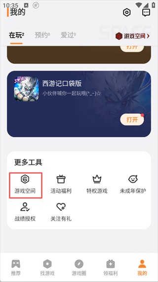 2、在【我的】页面,找到更多工具板块,点击游戏空间。
