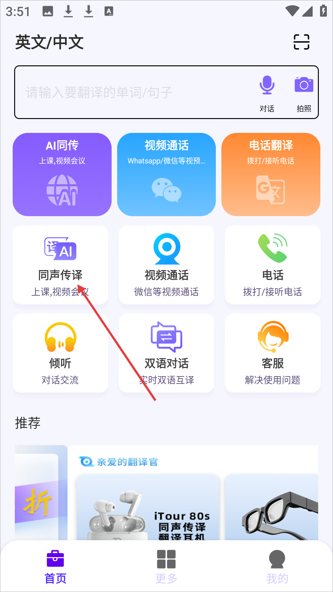 1、在本站下载并打开亲爱的翻译官手机版,点击同声传译。