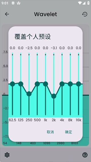 4、点击“图形均衡器”进入频率调节界面,可看到从54Hz到8103Hz的多频段调节滑块。
