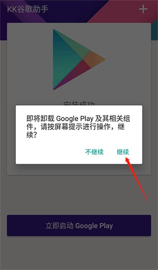 4、你要是铁了心要卸,就点右边的“继续”按钮,然后它就会一步步把谷歌服务框架这些东西从你手机里清出去。