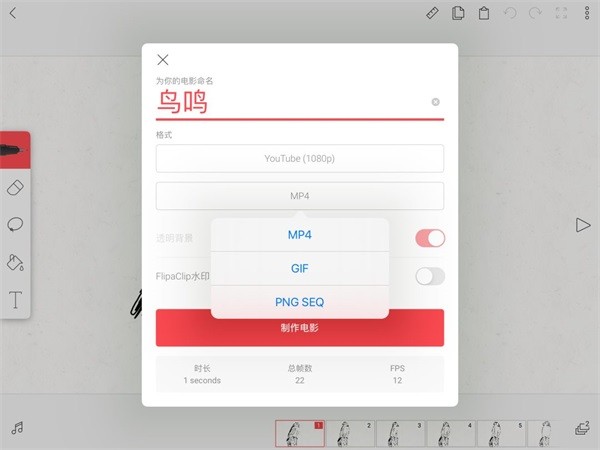 所有工序都完成了,最后一步就是导出。点右上角那三个点,选“制作电影”,就到了导出设置界面。这里可以选不同的分辨率,也能选导出成GIF动图或者PNG序列图,不过导出PNG序列图是付费功能。