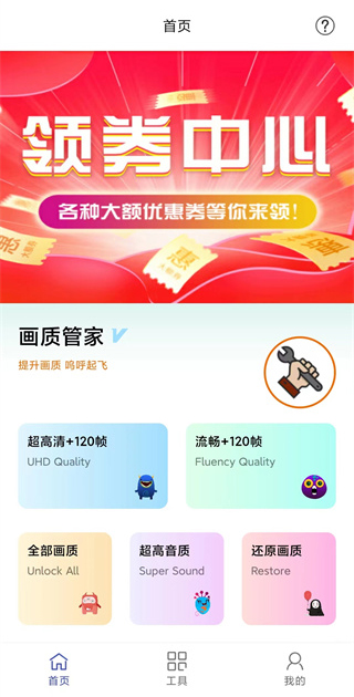 1、第一步我们打开画质管家App,在主页面选择你想设置的模式,有超高清+120帧、流畅+120、全部画质、超高音质以及还原画质五个功能,推荐使用流畅+120帧,对游戏流畅度的提升比较显著,点击流畅+120帧;