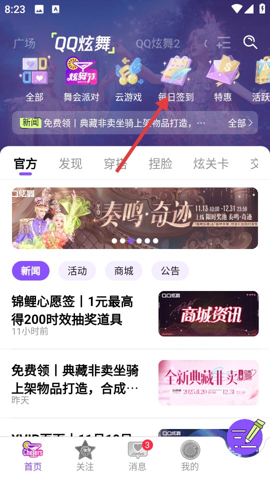 2、抵达首页后,你可以一览《QQ炫舞》的最新动态、新品发布以及版本更新详情;